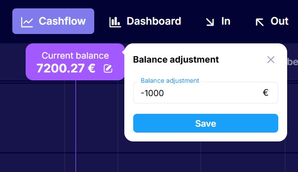 Therefore we have introduced an option to apply an automatic adjustment. Just click on the pencil icon next to Current balance displayed in the Cashflow section and you will be able to add an adjustment: